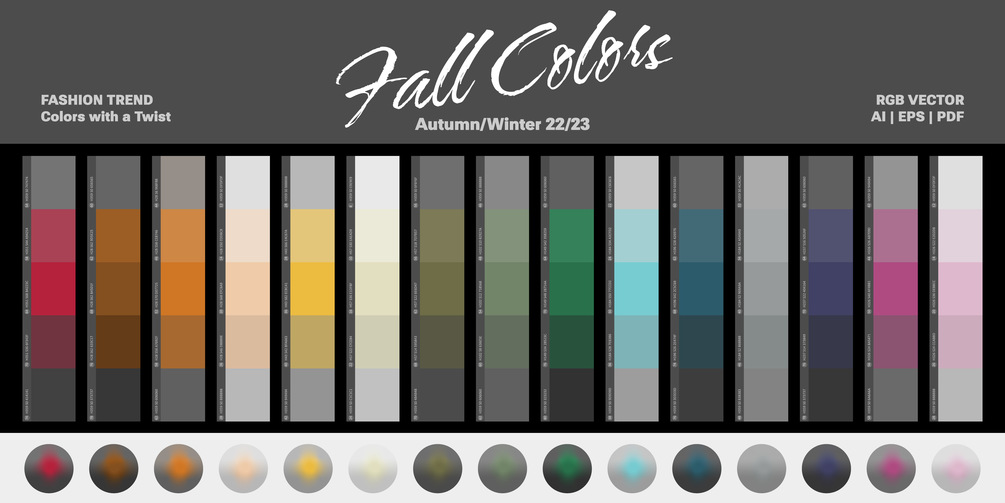A set of 240 Fashion Trend Color Palettes for Autumn/Winter 22/23 Fall - unofficial collection based on trend forecasts and adapted to the Twist color framework. RGB colors.