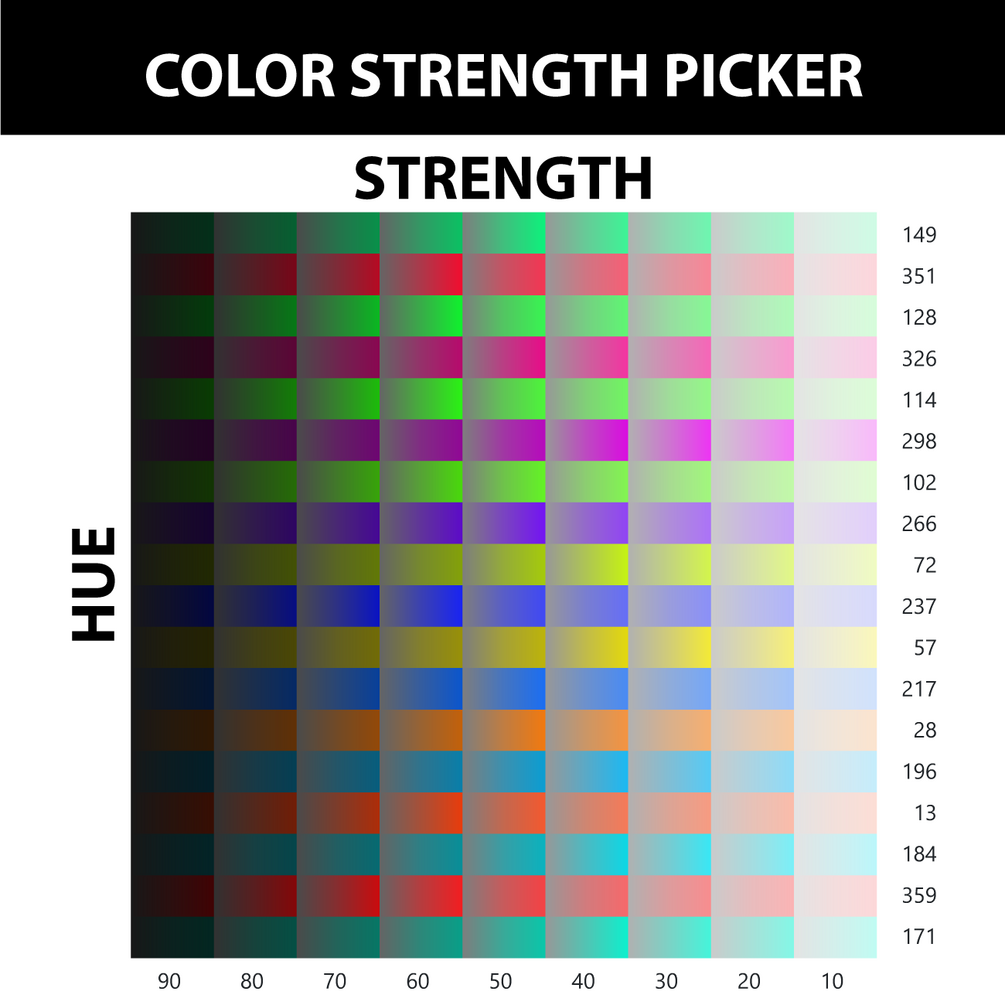 A handy graphic to use while designing. Pick a color based on the required strength (ctrl click in illustrator for a solid color or pick a gradient). The color strength was calculated using python and with that generated the color gradients programmatically. Potentially can save you a lot of time to find the right color strength for the application. If the hue you require is not in the list, then pick the nearest hue and adjust only the hue, to still have a similar strength.
